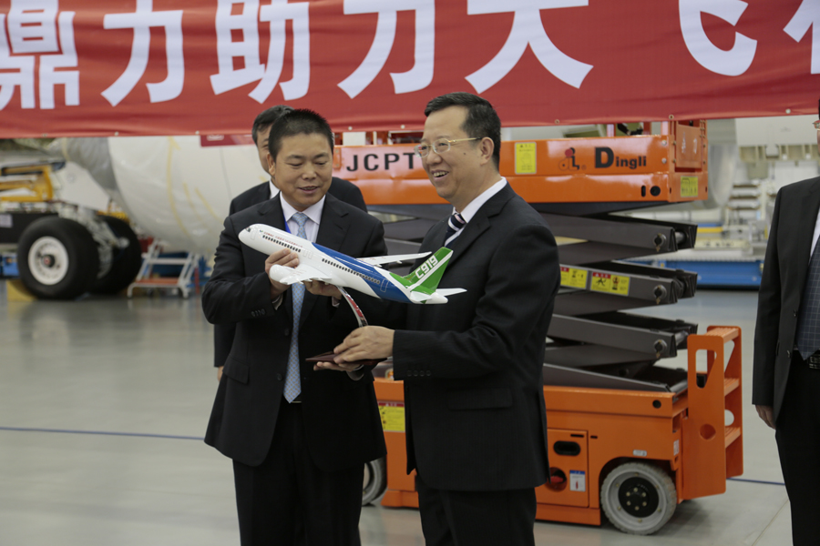 中国商飞公司副总经理刘林宗先生(前排右)向浙江鼎力董事长许树根先生(前排左)赠送大飞机C919模型
