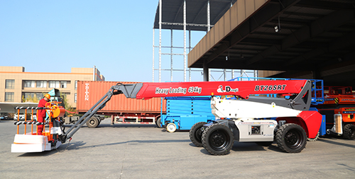 为确保这批定制版臂式顺利发货,12月下旬鼎力厂区内就上演了热闹的一幕。当天,多台红白灰颜色相间、最大工作高度26米的鼎力定制款臂式BT26SRT轻松坐上集装箱,顺利从鼎力厂区发往新加坡。