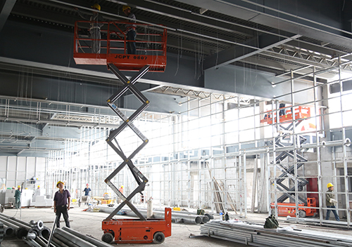 现在,距大会召开仅有4个多月时间,会址按要求力争在8月底建成。时间紧,任务重。工程涉及大量复杂的高空作业,如果用脚手架,搭拆都费时费力,工作时又不方便,并且效率一般。而高空作业平台则优势明显:升降灵活,操作人员可轻松进出受限空间;机动性极强,能够便捷迅速转换作业地点,尤其适用于多点位高空作业。