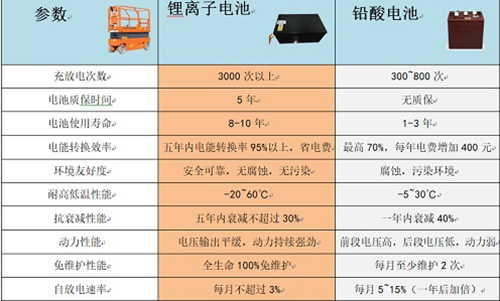 通过对比发现,锂电池的周循环容量保持率是铅酸电池的几倍,且在各种工况下,均能保持稳定的放电容量,很适用于高空作业平台产品的使用环境。