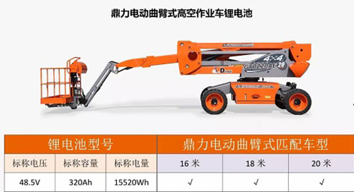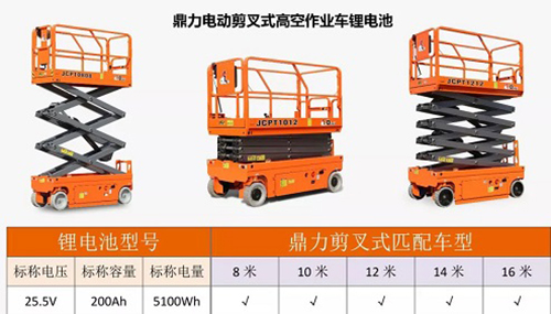 2018年3月,经数千次测试和实际产品运用,浙江鼎力合作研发的高空作业平台产品的专用锂电池正式问世,目前剪叉式全系列产品和自行走曲臂式电池驱动款产品可选配不同电池进行装配。