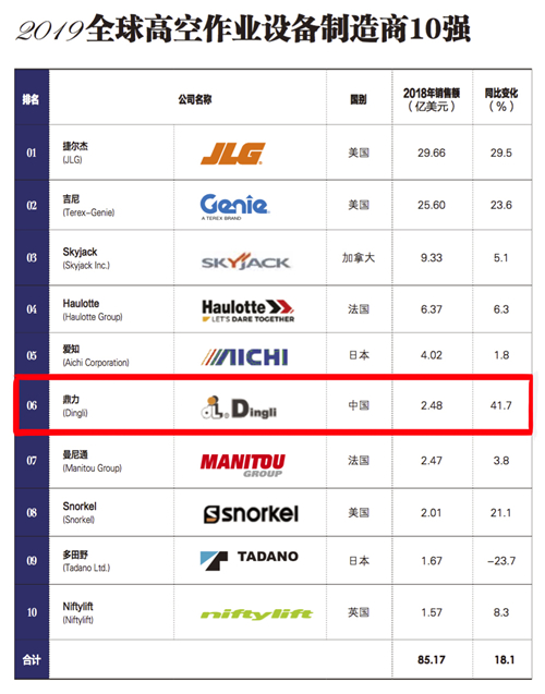 上述榜单中,除鼎力外,均为美、法、日等发达国家的知名企业,作为中国唯一上榜企业,浙江鼎力位列其中实属不易,这是对浙江鼎力品牌实力的充分肯定!