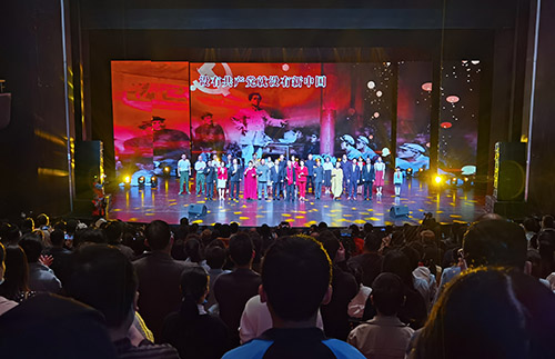 在全场观众的齐声合唱下,《没有共产党就没有新中国》的豪迈歌声响彻整个会场。