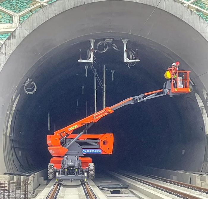 在大型基建项目中,轨道运输是提升效率的关键。鼎力轨道高空车专为隧道内作业设计,具备400kg荷载能力、12km/h的行驶速度,可快速完成设备转运和人员输送,适应复杂施工环境。
