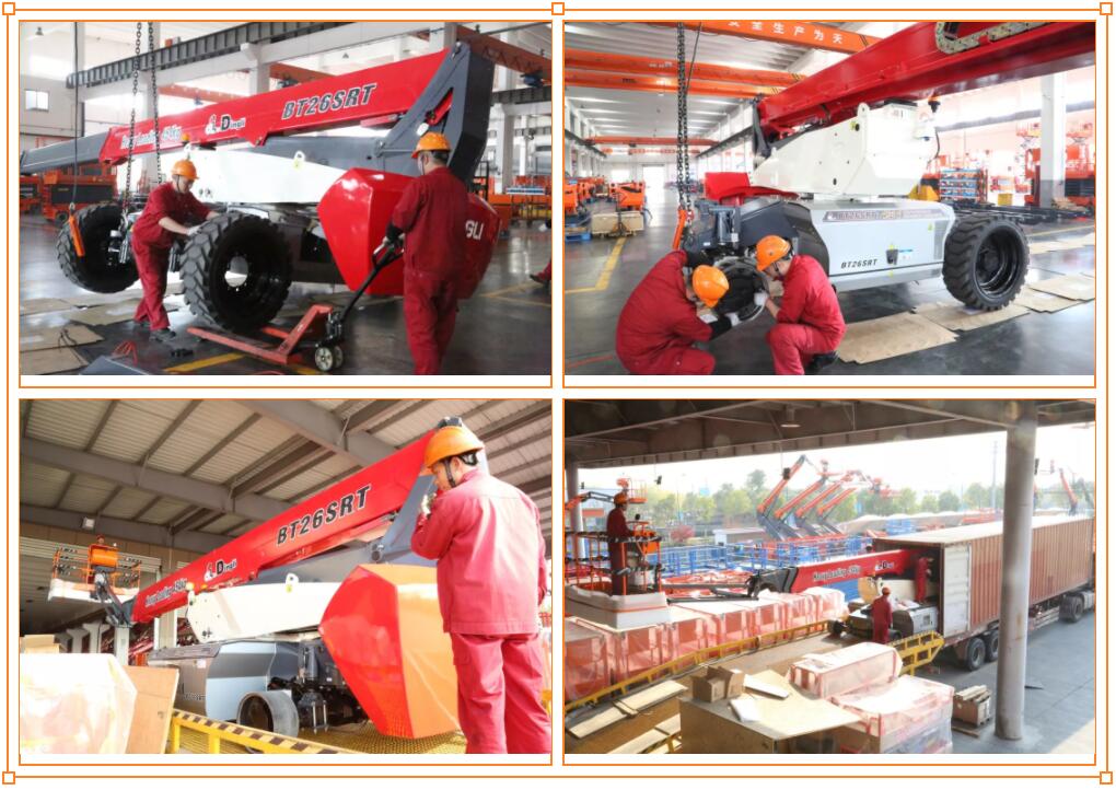 为确保这批定制版臂式顺利发货,12月下旬鼎力厂区内就上演了热闹的一幕。当天,多台红白灰颜色相间、最大工作高度26米的鼎力定制款臂式BT26SRT轻松坐上集装箱,顺利从鼎力厂区发往新加坡。