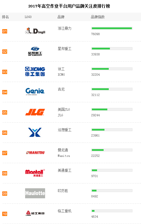 以领先的品牌指数荣登2017中国高空作业平台用户品牌关注度十强榜首。